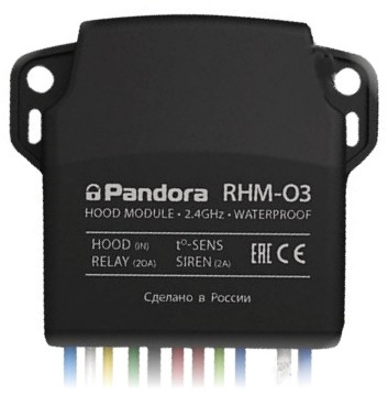 Подкапотный модуль Pandora RHM-03 значительно упрощает процесс установки сигнализации на современные автомобили — больше не требуется протягивать под капот из салона провода термодатчика двигателя, концевика капота, сирены, замка капота и управляющие линии реле блокировки — все эти устройства можно подключить к Pandora RHM-03, который связывается с базовым блоком сигнализации на частоте 2,4 ГГц. Модуль Pandora RHM-03 обладает практически вдвое меньшими габаритными размерами, нежели его предшественник — Pandora RHM-05. Корпус устройства абсолютно герметичен, а пластик (стеклонаполненный полиамид) не боится даже продолжительного нагрева до 150 градусов. В то же время, корпус может быть разобран и снова собран без потери герметичности. Pandora RHM-03 оснащен защитой от перенапряжения и восстанавливаемой тепловой защитой от повышенных токов в цепях электромеханических замков капота. Также в модуль встроен акселерометр, с помощью которого определяется движения автомобиля и включается блокировка в случае получения соответствующей команды от сигнализации. Модуль совместим со следующими системами: Pandora DXL 5000 Pro, Pandora DXL 3970 Pro, Pandect X-3000, Pandect X-1700.