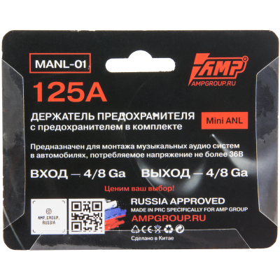 Держатель предохранителя (125 А) Один из самых важных элементов любой автозвуковой системы. Колбу с предохранителем следует устанавливать не дальше 40 сантиметров от источника питания. Номинал предохранителя выбирается исходя из сечения провода. Характеристики